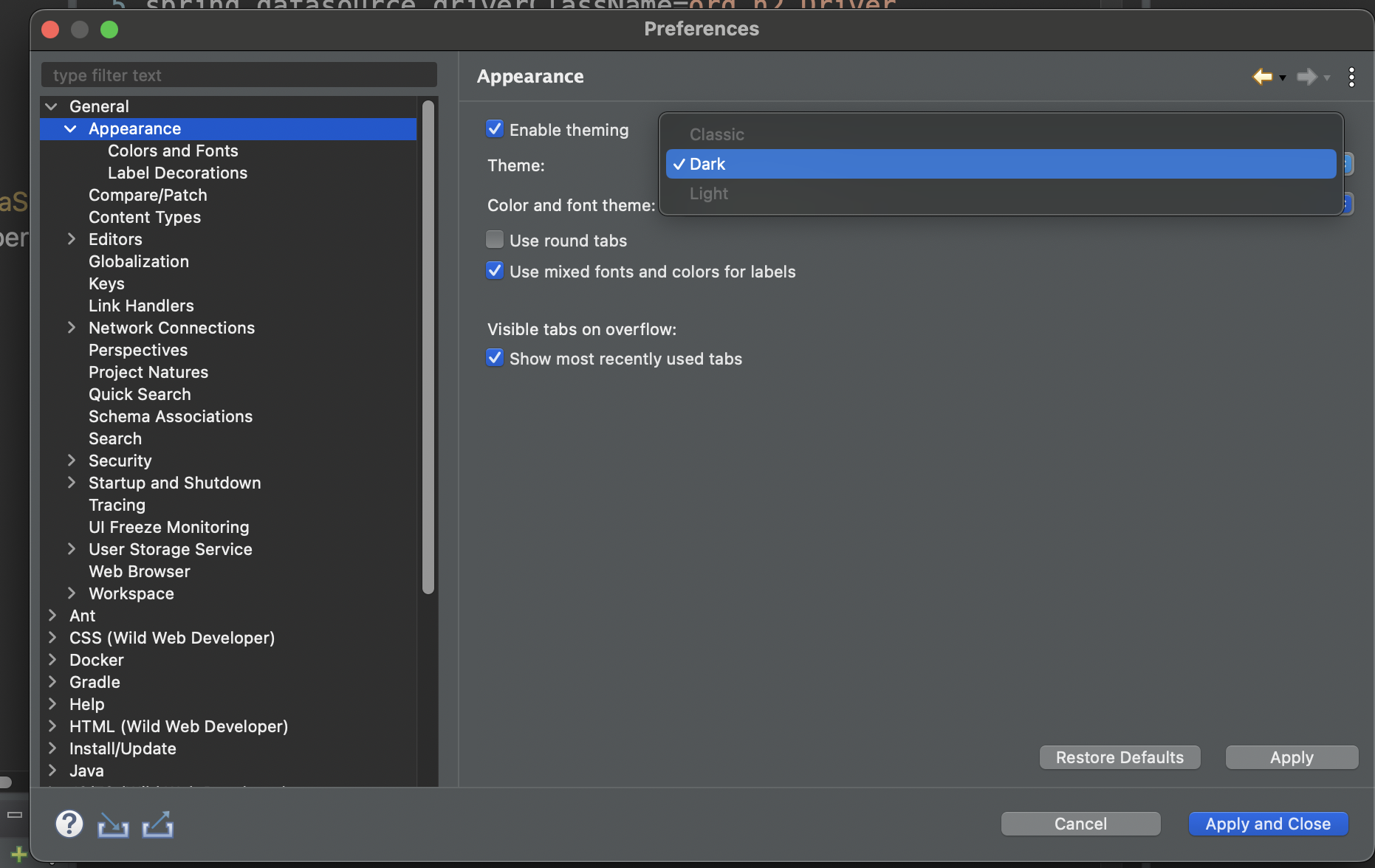 General > Appearance 로 들어가 Enable Theming 에서 Dark로 바꾼 후 Apply and Close 버튼을 누르면 적용된다.