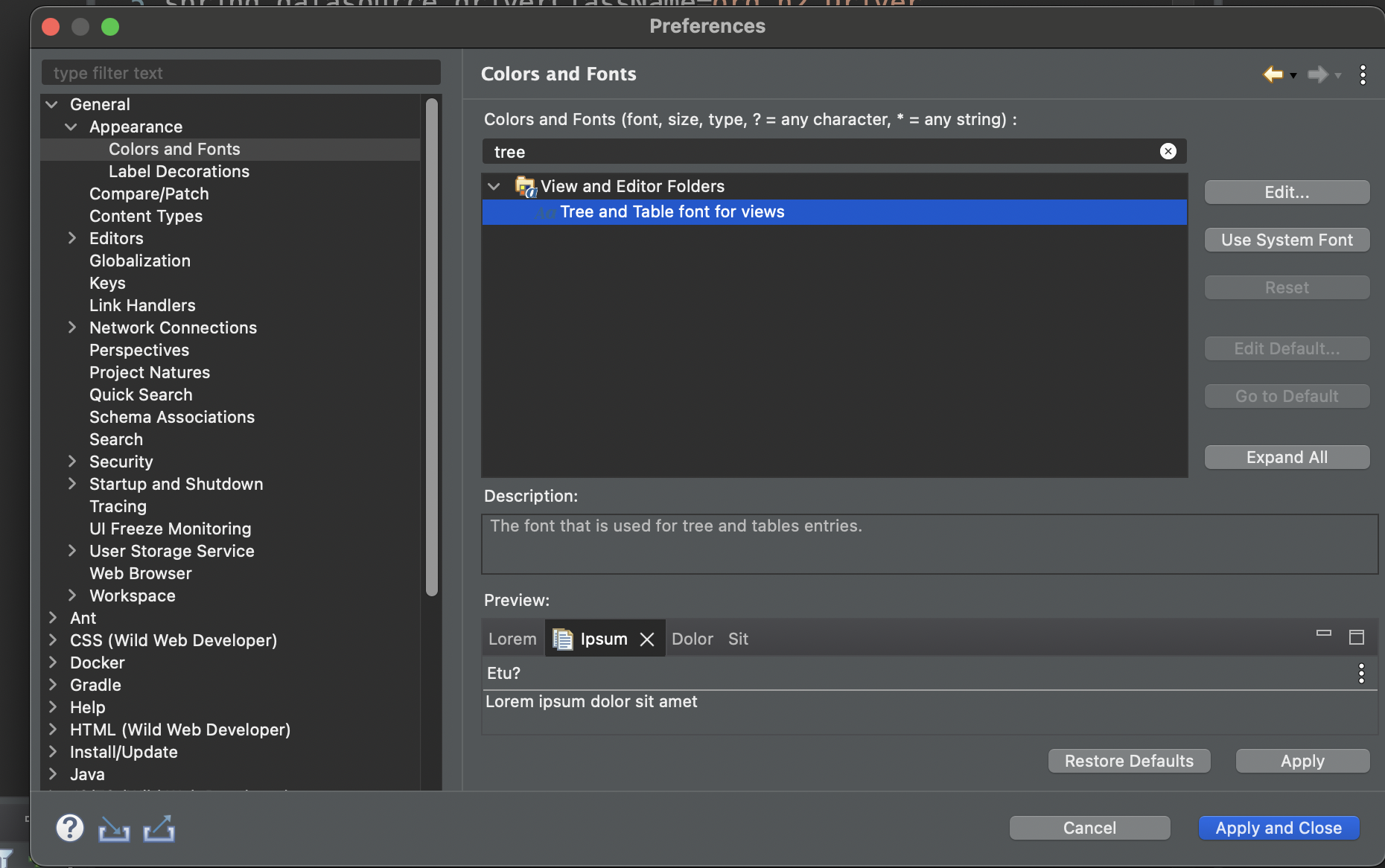 검색 창에 "tree"를 검색 해 "Tree and Table font for views"를 누르고 "Edit" 버튼을 누르면 Explorer 창에 적용시킬 폰트와 폰트 크기를 선택할 수 있다. 선택후 X를 눌러 닫은 후 Preferences 창에서 Apply and Close 버튼을 누르면 적용된다.