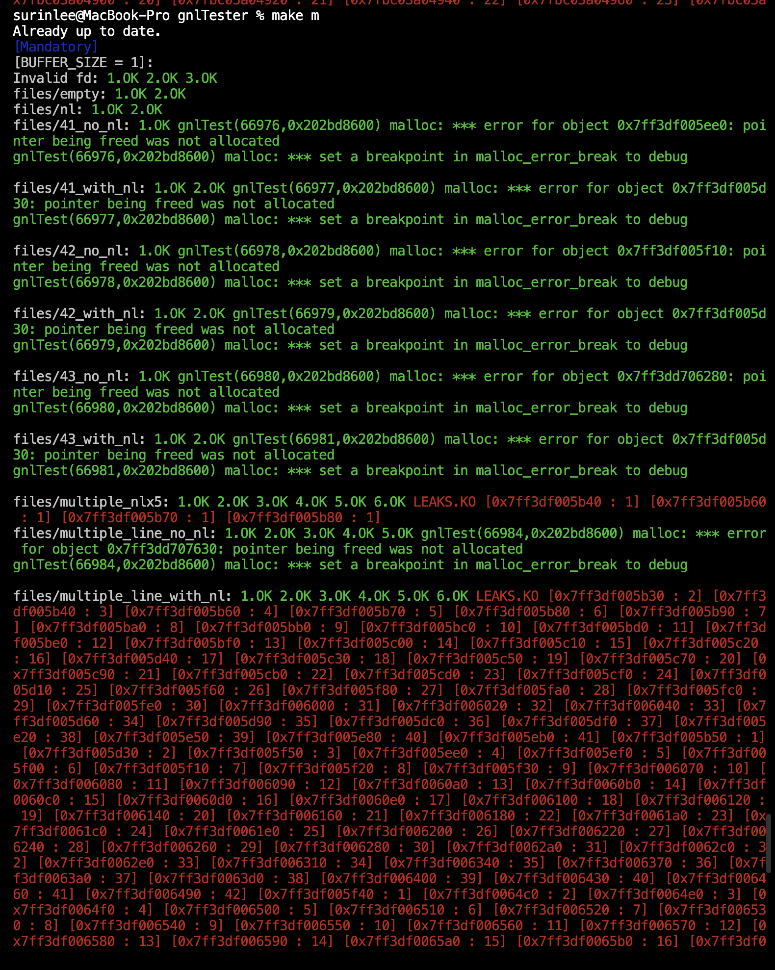 - 메모리 누수는 다 잡았으니, 이제 하나로 만들었던 get_next_line 함수를 부분 함수로 나누고, 부분 함수들의 name으로 break포인트를 잡아서 SIGSEGV를 먼저 잡고, KO 케이스를 잡으면 될 것 같다.