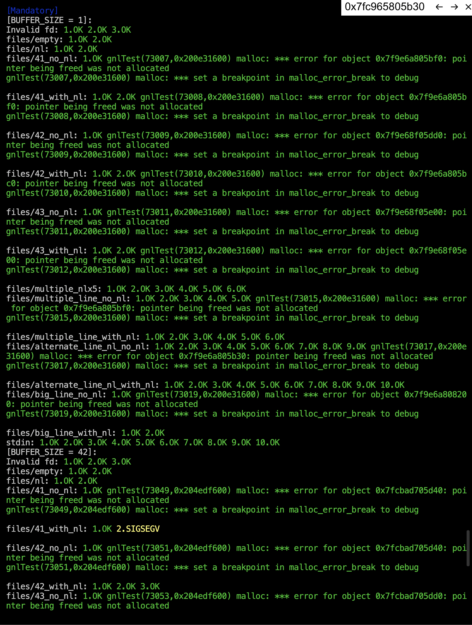 - SIGSEGV : 현재 SIGSEGV가 나는 테스트 케이스들의 공통점은 파일의 끝(eof)직전에 개행문자'\n'가 온다는 공통점이 있다.