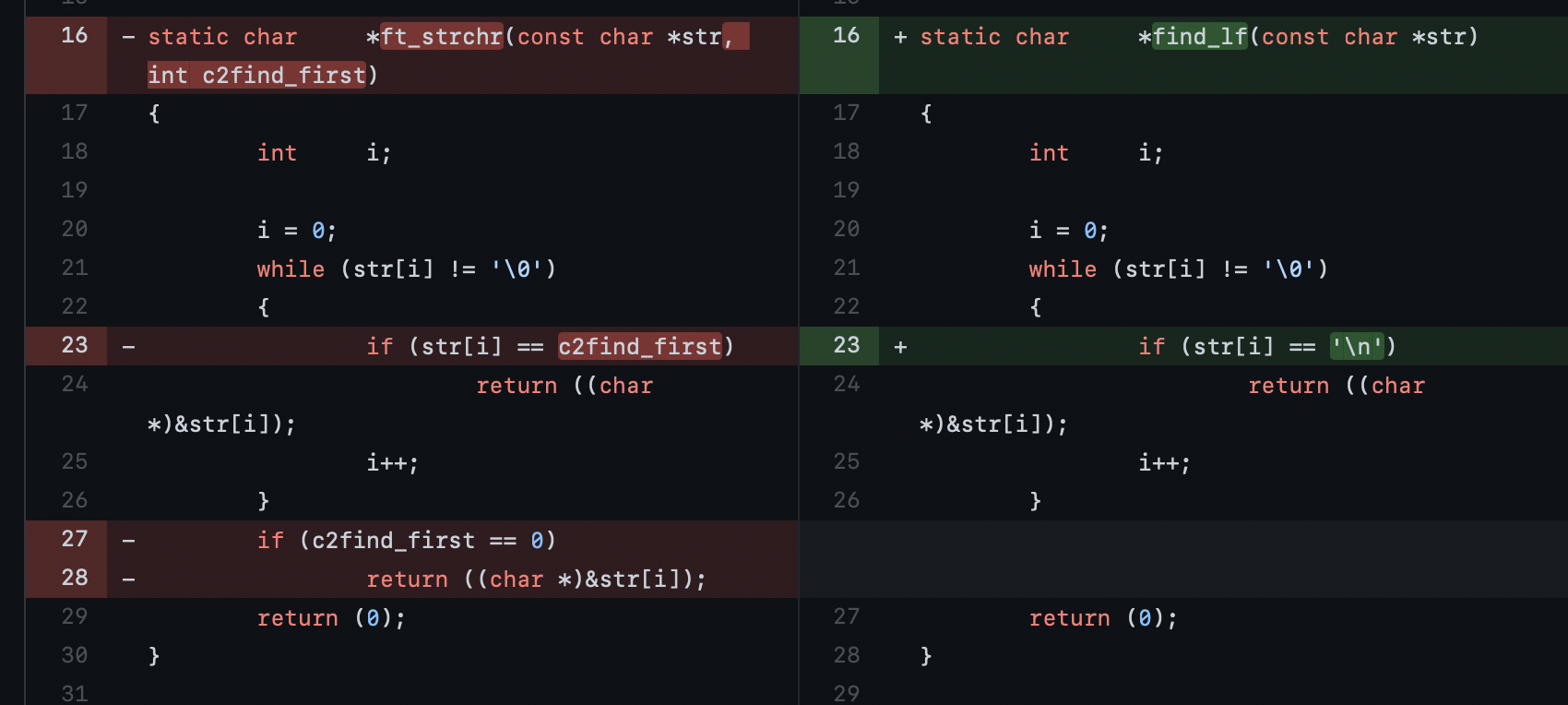 이전 C표준 라이브러리를 구현하는 과제에서 만든 ft_strchr()(manual 기준, strchr()와 동일하게 작동한다)를 그대로 가져와서 썼었는데, 그러다 보니 가로줄 제한에서 아주 큰 몫을 차지했다! 어떻게 가로줄을 줄일지 보고 있는데, 마침 이 함수를 쓸 때가 문자열 내에 개행문자('\n', LF라고도 함)가 있는지를 확인 할 때 뿐이어서, 함수의 이름도 살짝 줄이고, 두번째 인자를 받지 않게 함으로서 가로줄을 줄일 수 있었다. -> 두번째 인자를 받지 않음으로서, if조건문도 하나 줄게 되었다.-> 굳이 여러 케이스에 대해 쓰지 않을 함수는 딱 제 역할만 하게끔 만드는게 좋겠다 하는 생각도 들었다.
