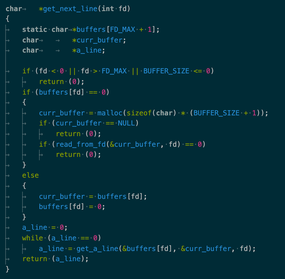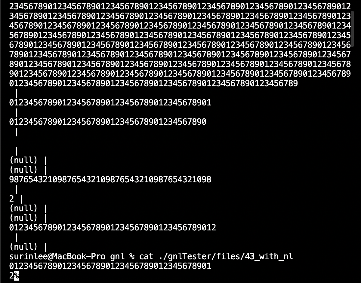 각각의 gnl 호출 결과 값은 ' |'로 구분해서 출력했다. null은 더이상 읽어들일 내용이 없을때 (eof에 도달했을 때) gnl이 정상적으로 반환하는 캐릭터 포인터 값이다.