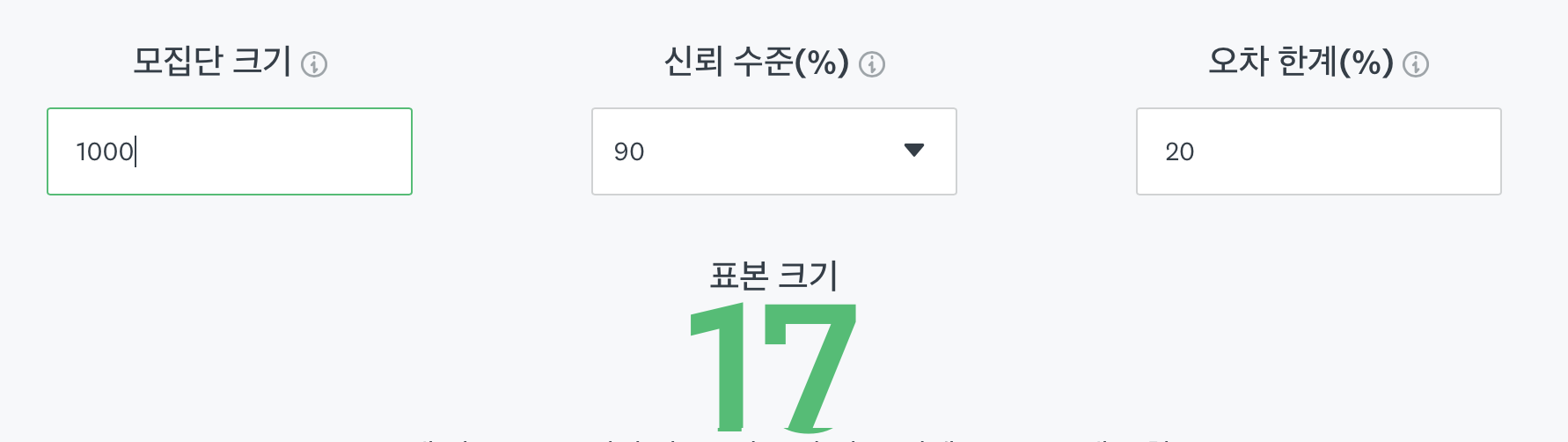 위 사이트의 계산기를 사용해 신뢰 수준 90%를 유지하는 수준에서 적절한 표본크기를 정해봤다.