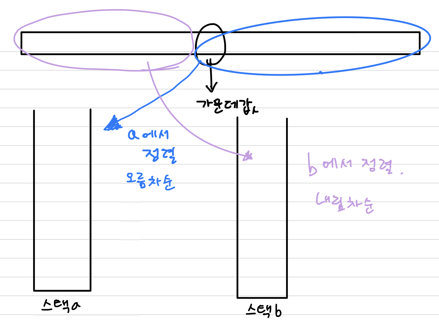 위의 방법대로 표본을 뽑아 들어온 입력값의 평균값(근사치)에 가까운 값을 기준으로 스택 a와 스택 b에 나눠서 각각 오름차순, 내림차순으로 정렬한 뒤, 스택 b의 top에서 스택 a의 top으로 모두 옮기는 것이다.