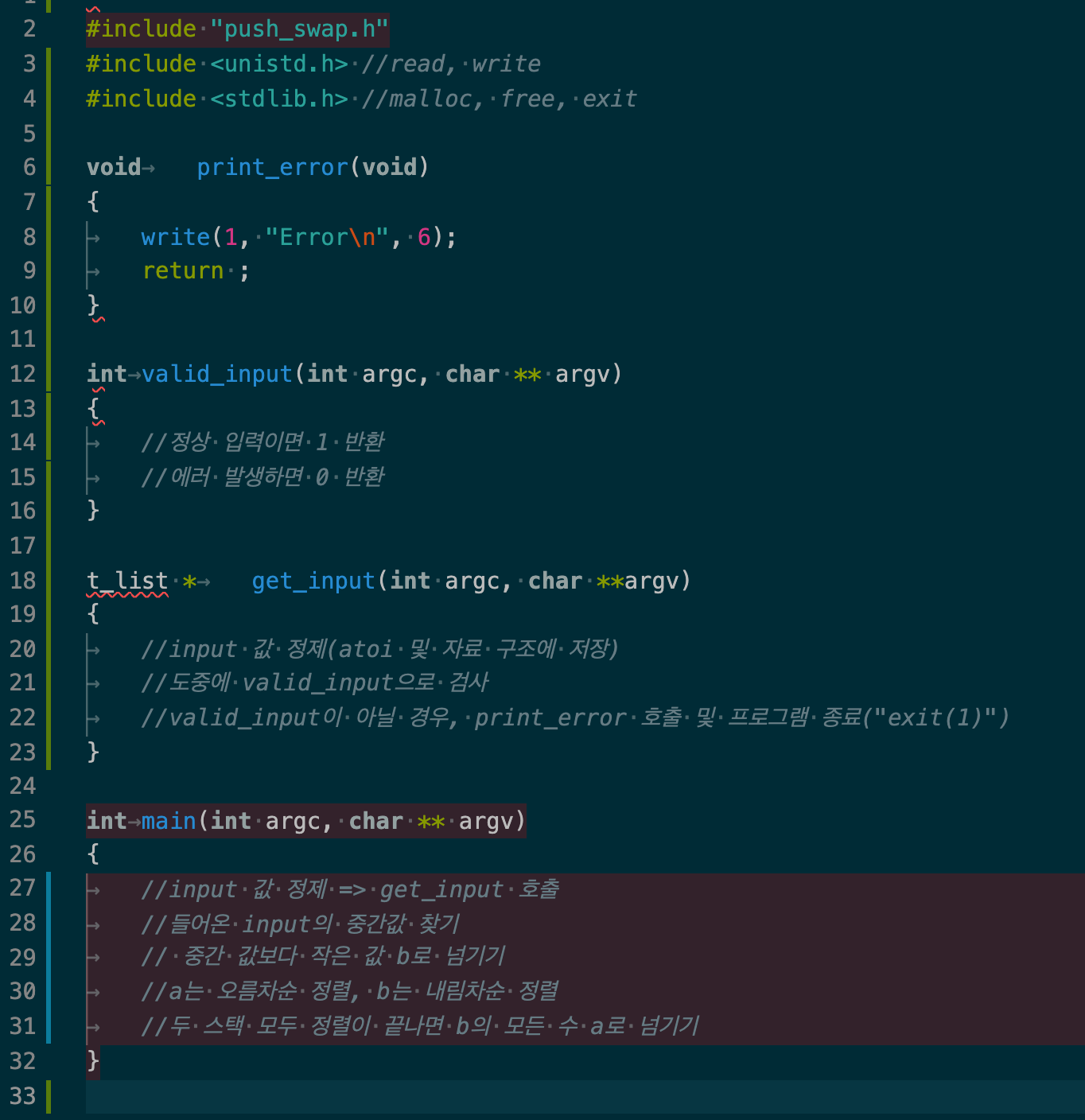 먼저 과제에서 요구하는 에러 메세지가 출력되는 사항들을 처리하는데 필요한 인자와 함수들에 대해서 정리해봤다. 그리고 " "(따음표 안에 digit 없이 space만 들어온 경우)와 같은 케이스에서는 에러처리(혹은 아무일도 일어나지 않고 프로그램 종료)를 해야하고, 또 정상 입력값에서는 하나의 string을 여러개의 int(정수)입력값으로 바꾸어 줘야하는 데, 이 부분에서 이전에 문자열 split에서 쓰기 위해 만들었던 함수 get_count를 쓰면 정상 입력값 처리 및 에러 케이스 처리가 수월할 것 같아 가져다 쓰기로 결정했다.
