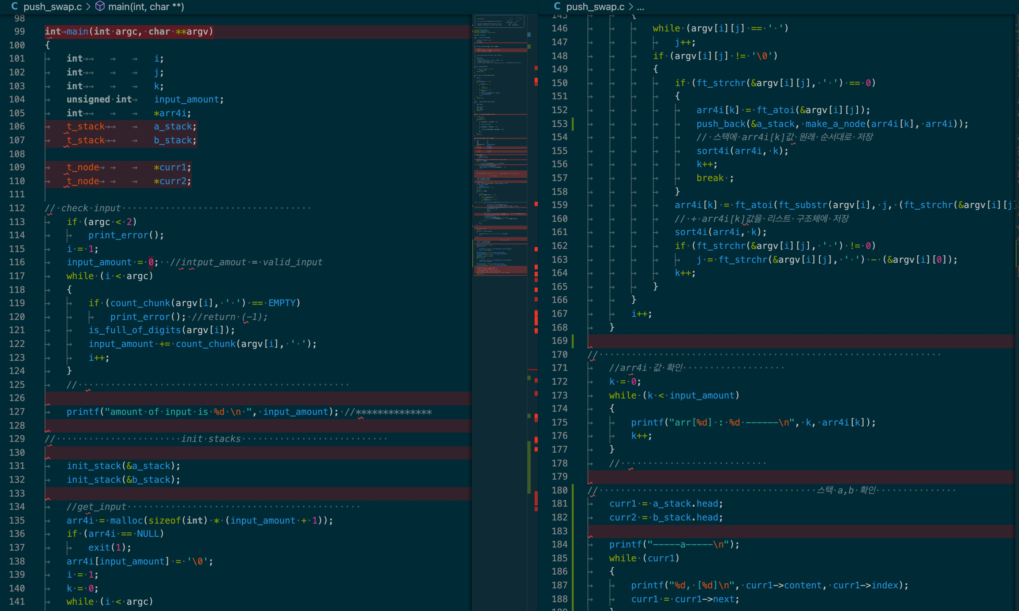 현재까지 push_swap 프로그램의 main 문을 거의 하나의 함수로 쭉쭉 써내려가고 있었는데, 이제 작은 함수들로 한번 분리 하는게 좋을 것 같다. 더 이상 길어지면 가독성이 너무 떨어져서 작업하면서 헷갈릴것 같다.