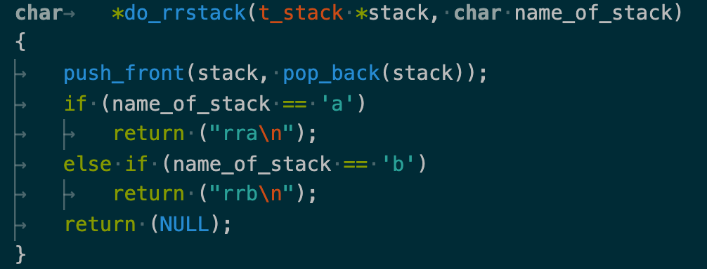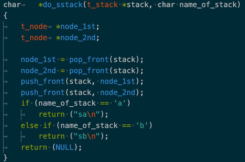이제 과제에서 요구한 pa, pb, sa,sb, ss, ra, rb, rr, rra, rrb, rrr명령어들을 구현할 차례이다. 각각의 명령어에 대한 함수에서 각 명령을 처리하고 단순하게 명령을 "출력"하는 형태로 만들 수도 있지만, char *를 반환 함으로써, 각 명령을 내릴때마다 "pa\n"와 같은 char string을 반환 하게 하고, 이를 잠시 char **형 버퍼에 저장해 두었다가, 합칠 수 있는 명령어 인경우 명령어를 내리는 횟수를 최소화 해볼까 한다.(ex sa, sb가 연달아 나온경우 ss만 출력)따라서 위 명령어들은 char * 자료형을 반환하게 만들 생각이다.