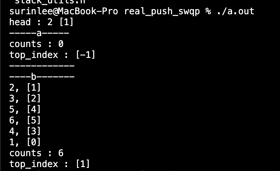 단, 현재 이 swap_stack 함수에서는, 파라미터로 들어오는 스택의 노드 갯수가 2개 미만(counts <2)인 경우를 따로 고려하지 않았으므로, 사용에 주의를 요한다. counts<2인 경우 굳이 swap 명령이 아니더라도 rotate명령으로도 같은 효과를 얻을수 있기때문에, swap 명령은 counts <2인 경우 사용하지 않을 작정으로 구현했다.