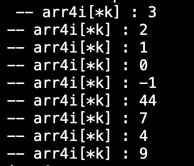 현재 arr4 배열의 끝에 문자열 처럼 '\0' 문자를 넣고 배열을 사용 했는데, 문제는 arr4i가 int형 배열이라,