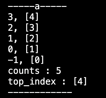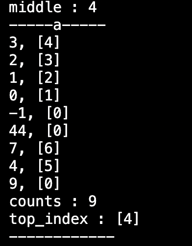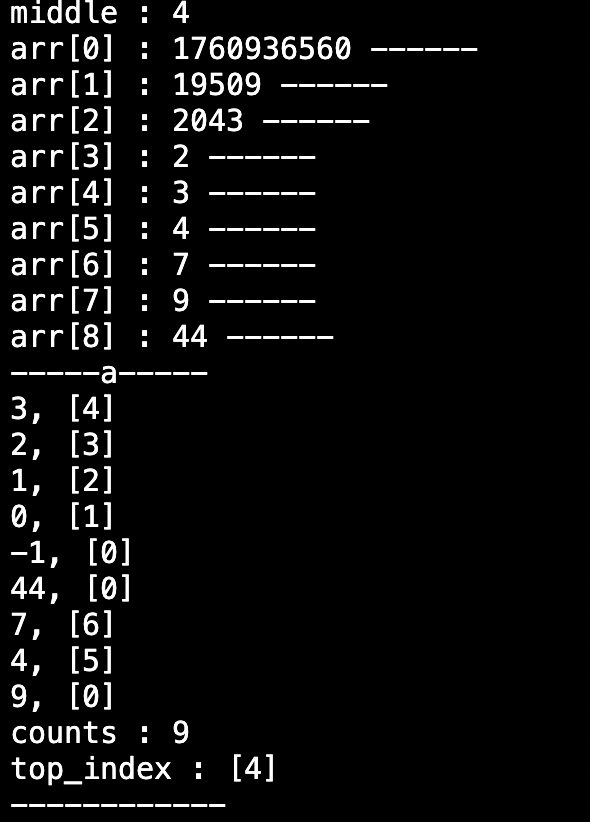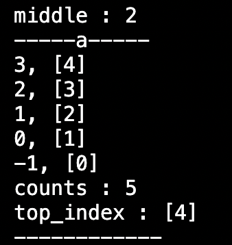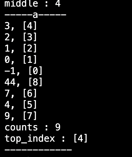 middle 값이 잘 출력되는 것을 확인하려고 좀 더 많은 input을 넣어봤는데, 스택 a에 저장된 노드들의 index가 일부 변하지 않은게 확인 되었다.