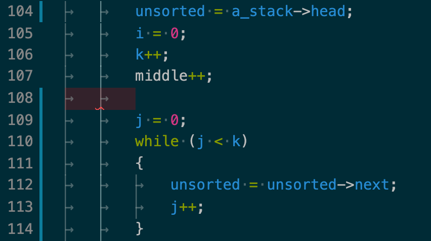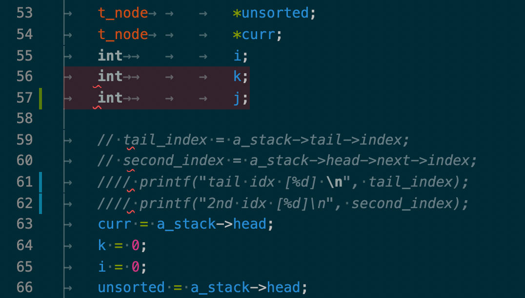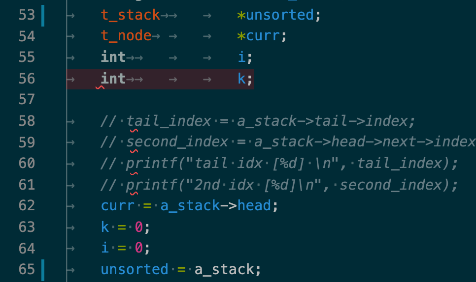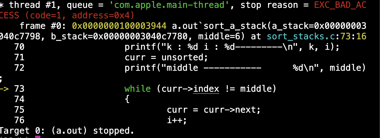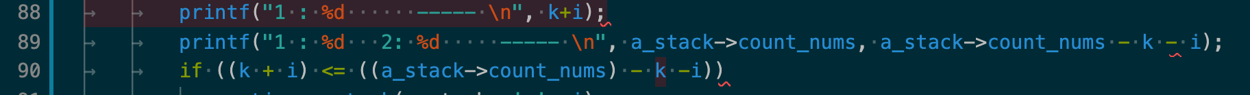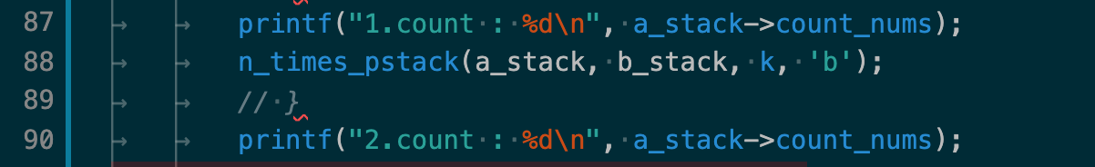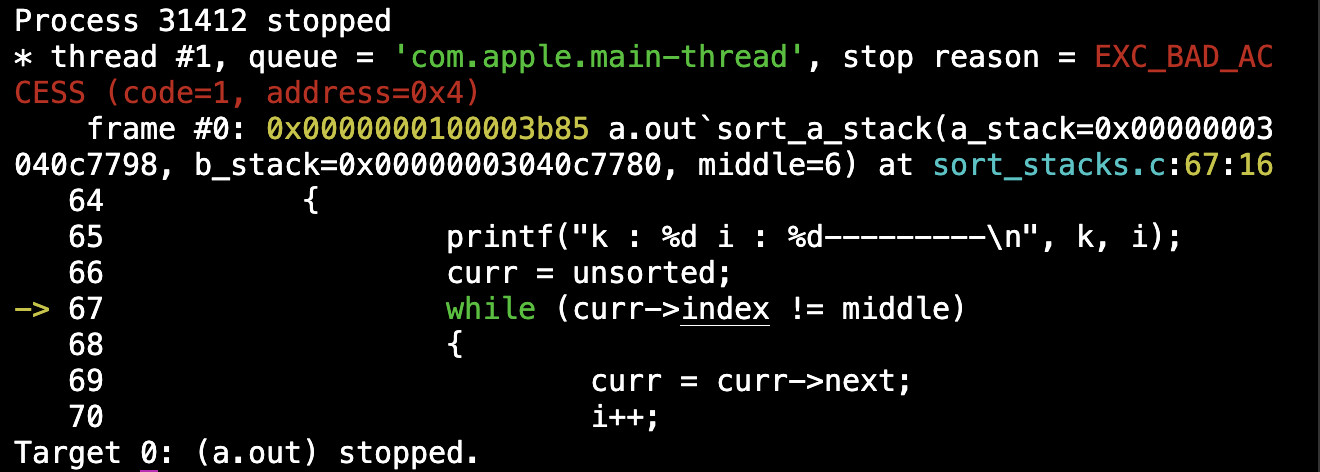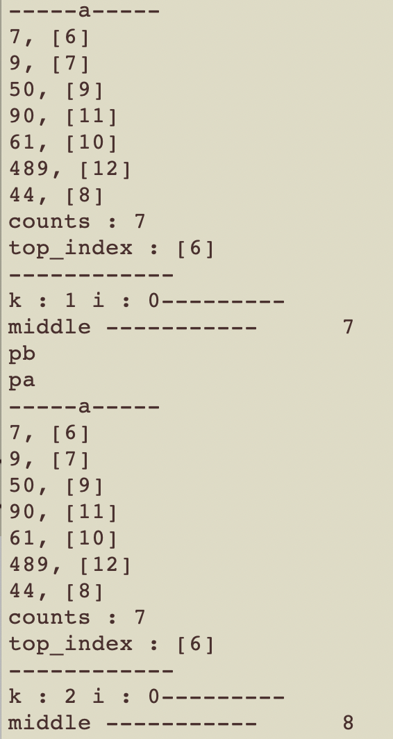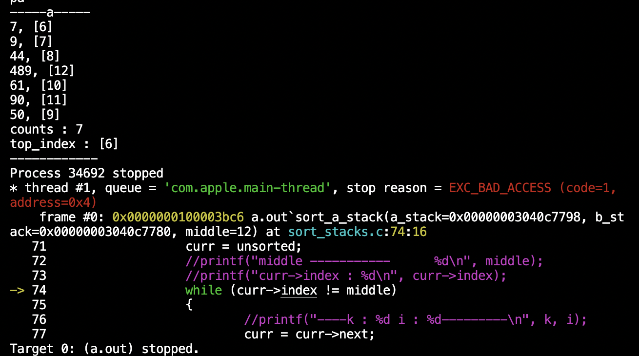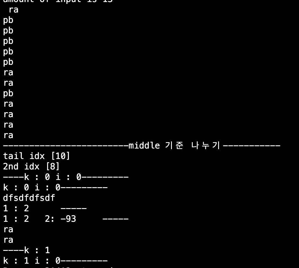 a_stack을 오름차순 정렬하는 함수인 sort_a_stack에서 sigfault가 발생했다. 그래도 이전보다 출력결과가 더 나와서 금방 원인을 알 수 있을 것 같다. k와 i 인덱스가 middle 값을 제일 앞으로 가져온 이후에 제대로 작동(증가)하지 않음을 알 수 있었다. -93 라고 출력된 부분이 원인음을 직관할 수 있었는데, sort_a_stack에 이런 출력문을 호출했기 때문이었는데, 위의 출력 결과를 낼 당시에는 "1 : " 뒤에는 인덱스 들의 합인 k + i를 출력하게끔했었어서 2라고 나왔는데, 아래 89번째 line처럼 수정해서 돌려본 결과,