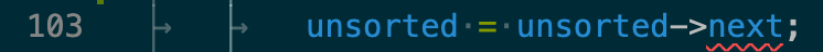 이를 해결하기 위해서 직관적으로 딱 생각난 방법은 unsorted의 자료형을 바꾸는 것이었다. t_node가 아닌 t_stack으로, 연결 리스트를 가리킬수 있는 t_stack 포인터로서 선언하고, 한 노드씩(?) 다음으로 넘기려 했는데, 바로 이 방법이 잘못되었다는 것을 깨달았다. a_stack에는 next가 없기 때문이었다. 그래서 다시 t_node로 자료형을 바꾸고 while 문의 끝(103 line)에서 unsorted 값의 할당하는 방법을 바꾸었다.