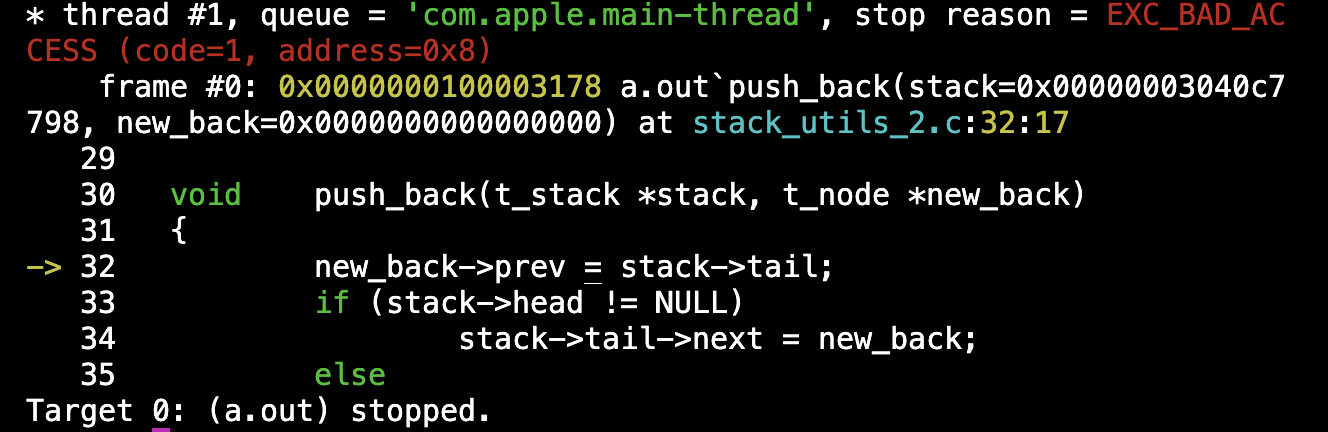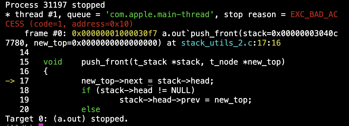 지난 포스팅에서 pop_front 함수에서 lldb 디버거로 문제가 있음을 확인 했다. 28번째 줄에서 stack이 비어있을 경우에 stack이 비어있는데 head에 접근하려고 해서 생기는 sigfault라고 판단하고, stach에 head가 존재할 경우에만 작동하게 설정했다.