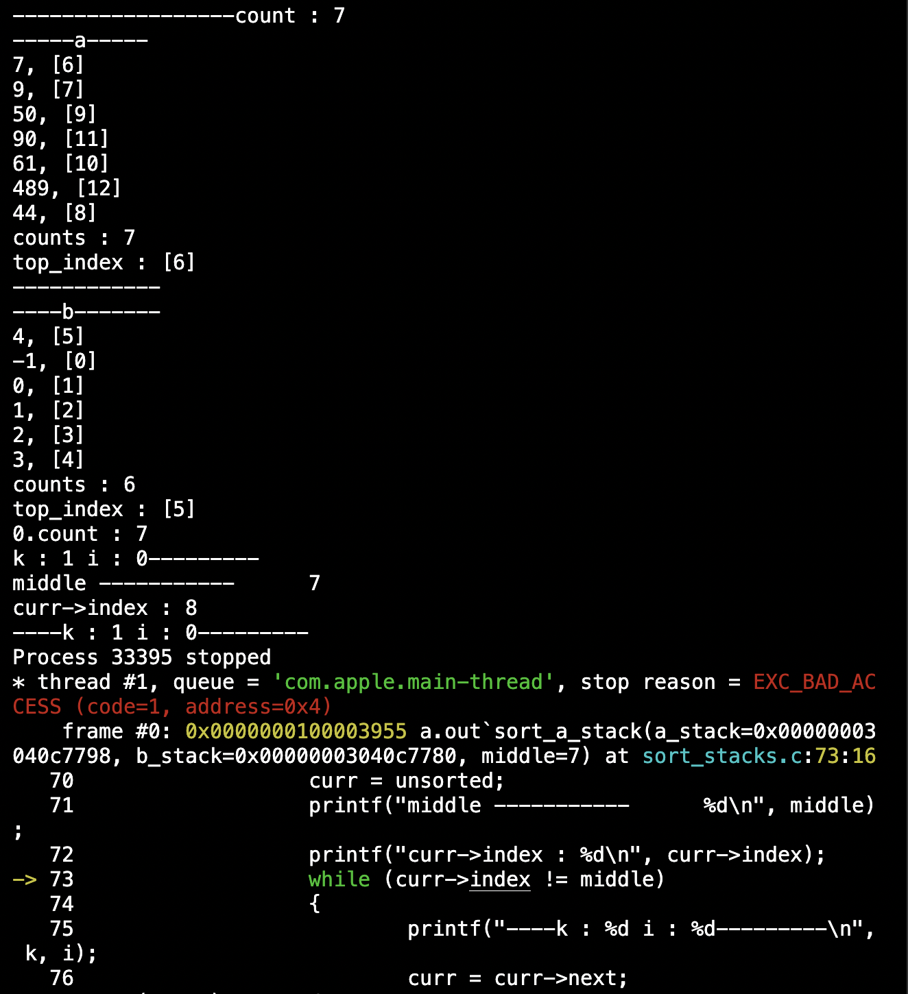 a_stack에서 첫번째 middle 값인 6이 a_stack의 top에 정렬되어있었다. 그러나, 정렬이후 +1 증가한 7로 변경했었어야했는데, 동일하게 middle이 될때까지 curr 노드를 이동 시켰으니, (k는 +1 되었다) a_stack의 입장에서는 9(index=7)부터 쭉 찾았는데도 middle에 도달하지 못했고, a_stack이 끝나버려 sigfault 가 발생한것이었다.