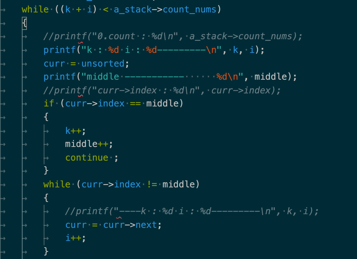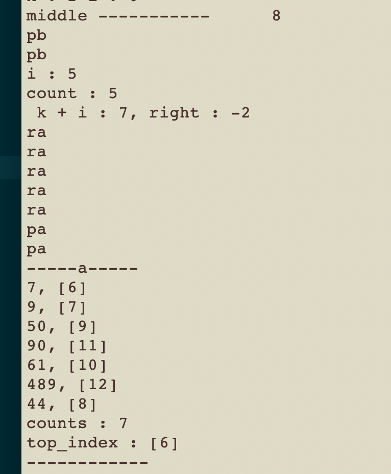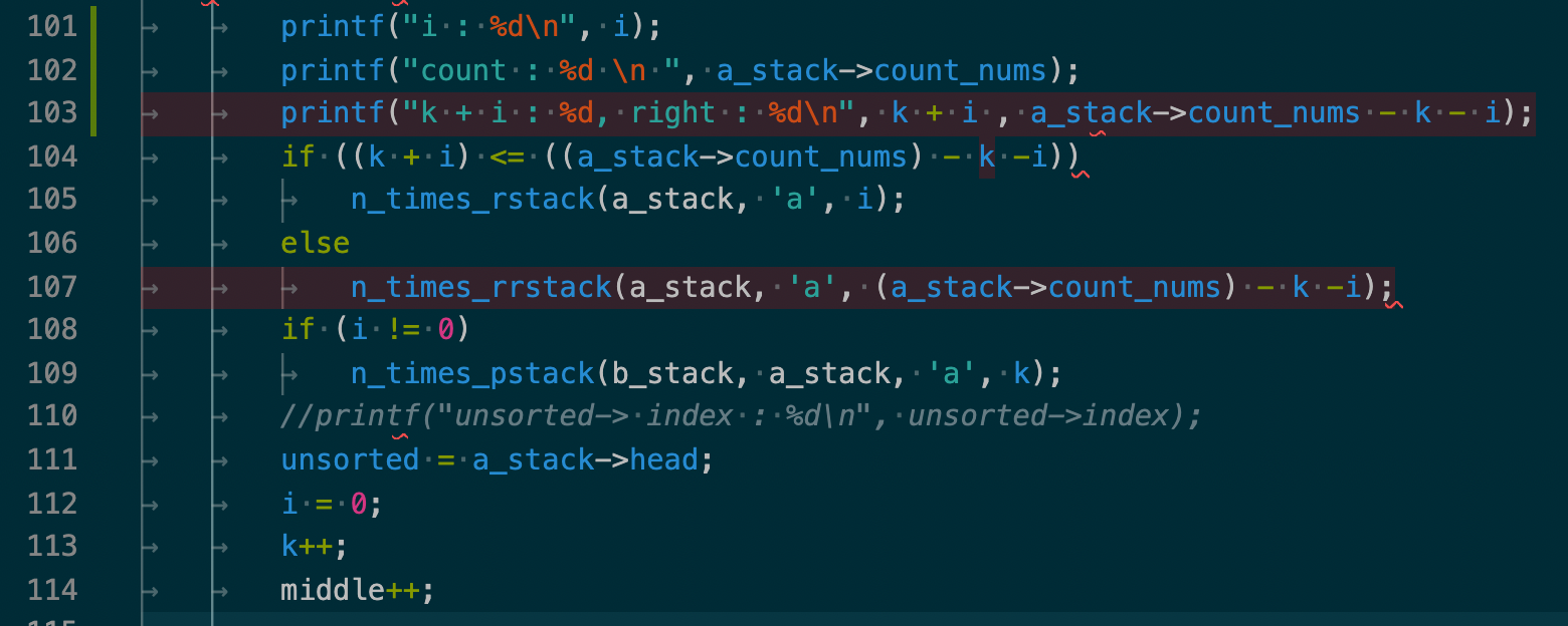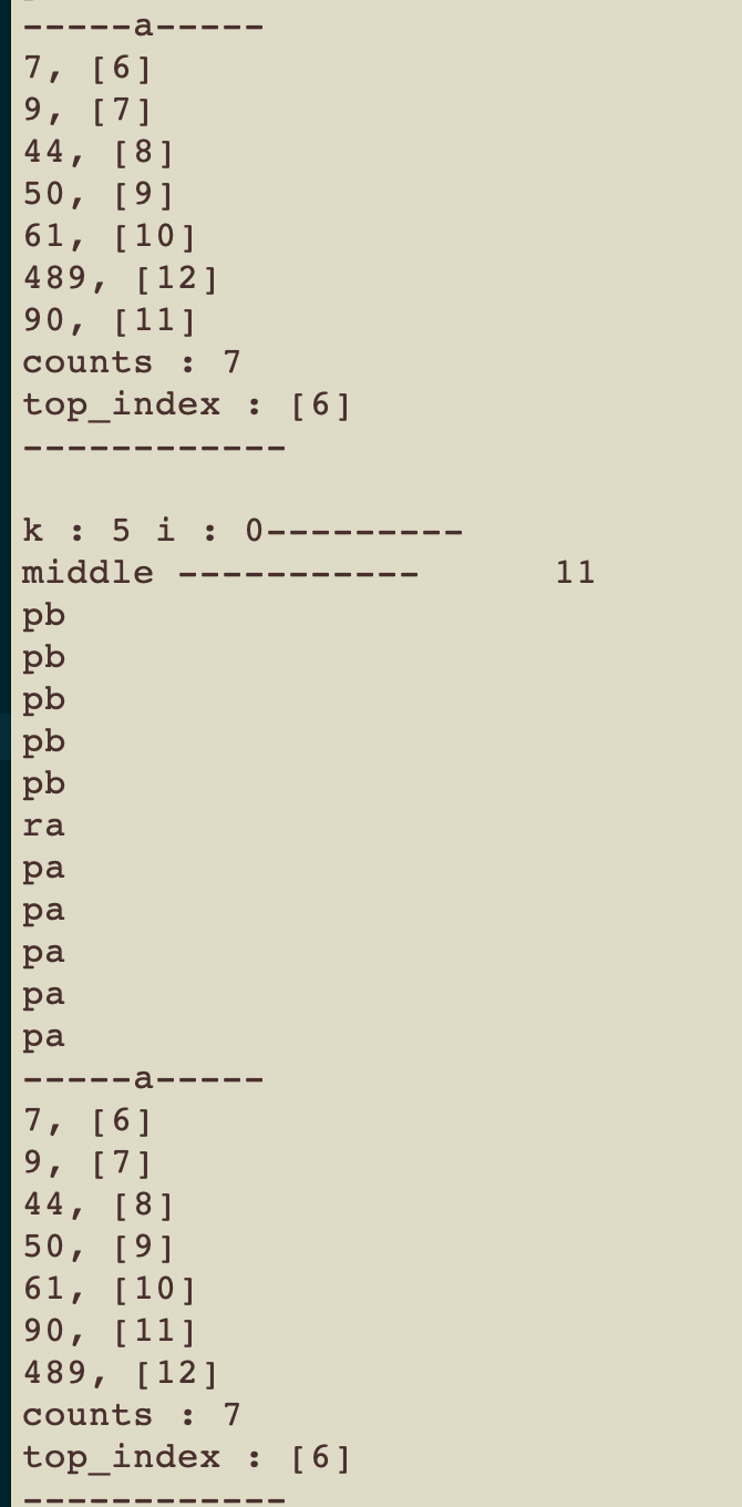 원인은 104 line의 if문안에서, 이미 k개 만큼의 숫자(이미 정렬된 부분)을 b스택으로 넘긴 상태에서 a_stack->count_nums에 접근해 다시 k개 만큼 뺀 값을 사용했기 때문이었고, 해당 부분을 logic에 맞게 다시 수정하였다.