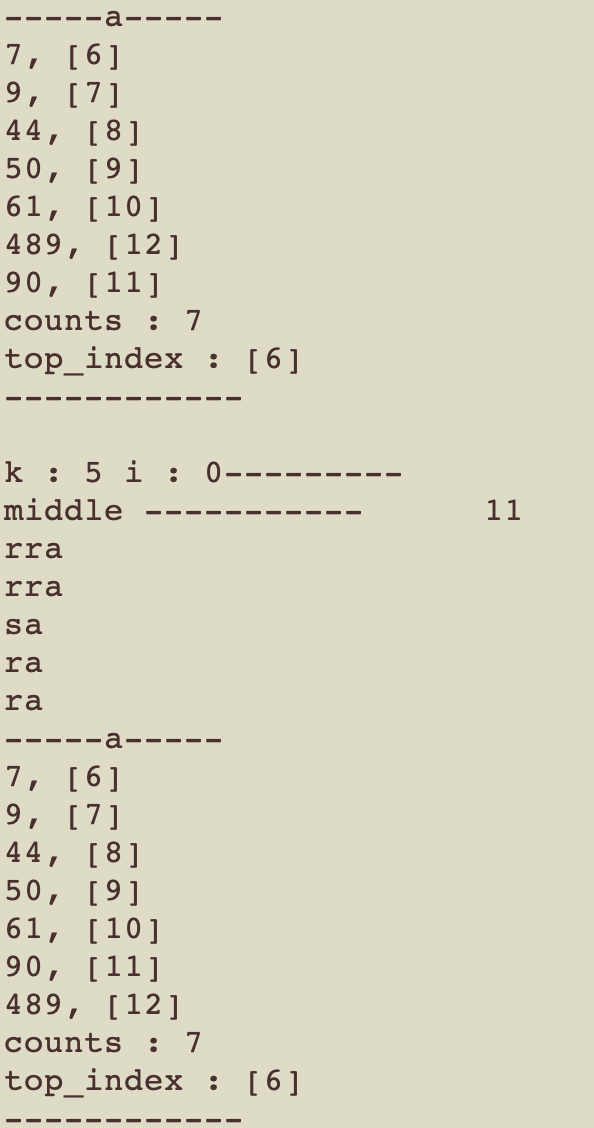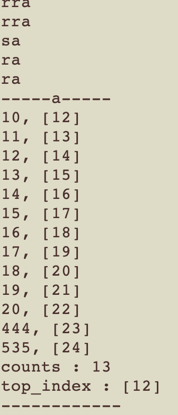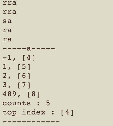 끝부분에 3개만 남았을 때, 4개, 5개에 대해서도 최적화를 진행 할 수 있을 것 같은데, 일단은 b_stack에서의 내림차순 정렬부터 구현하고, input 값에 따른 명령어 수를 확인 한 후, 필요에 따라 최적화 해보기로 한다.